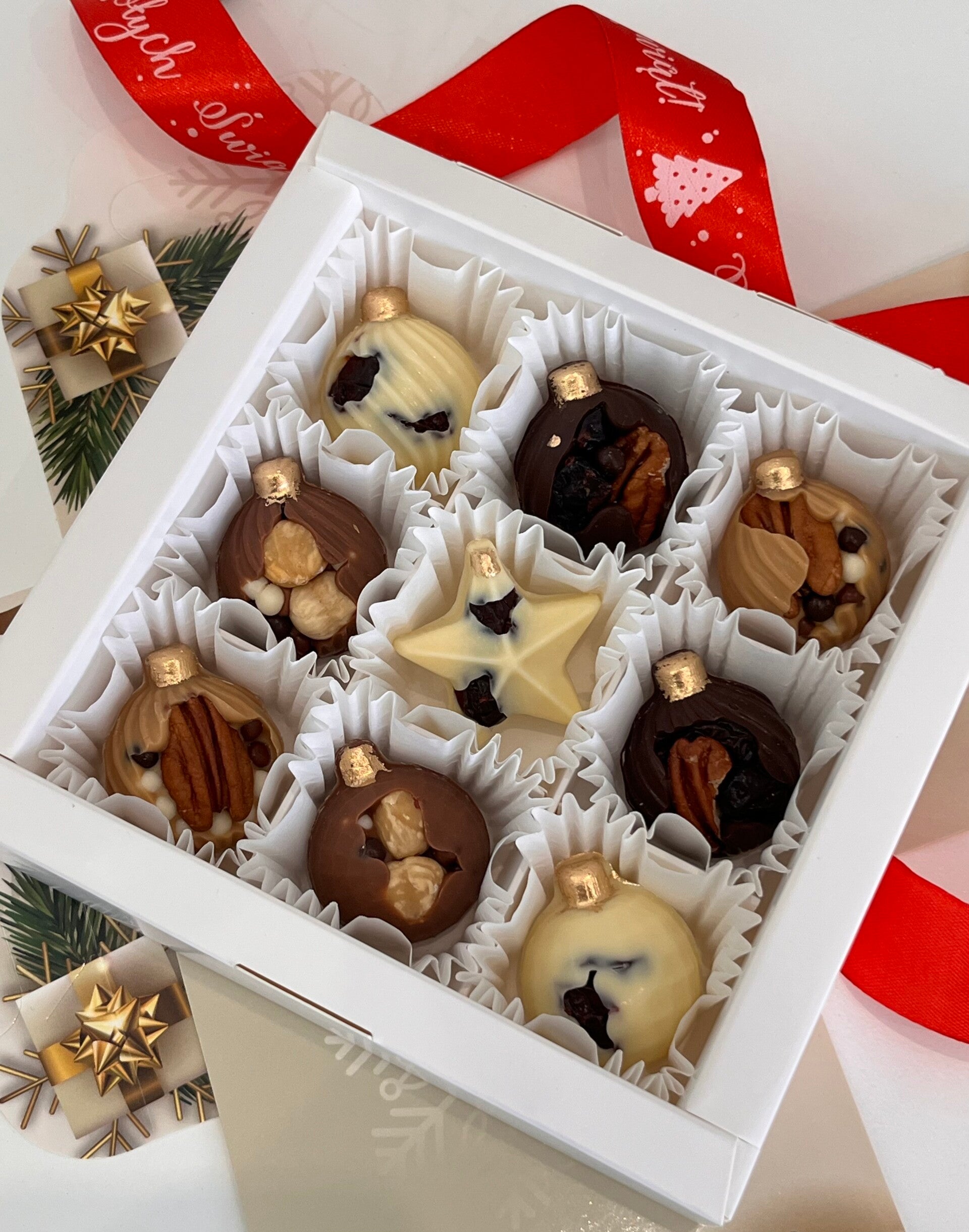 Ręcznie robione pralinki z belgijskiej czekolady w kształcie bombek świątecznych. Idealne jako słodki prezent pod choinkę lub upominek dla bliskich.