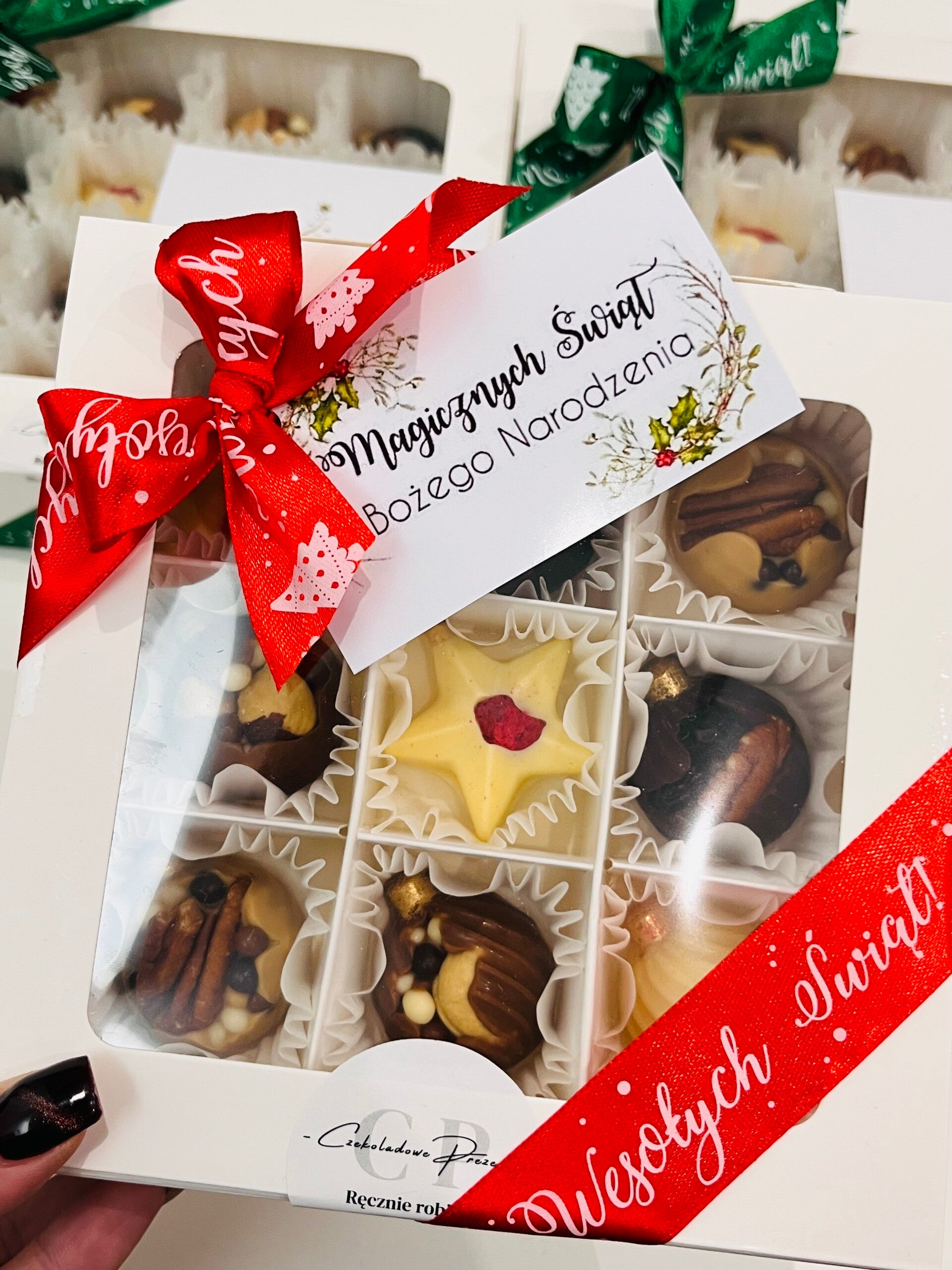 Podaruj odrobinę luksusu i świątecznej magii! Nasze pralinki to wyjątkowe połączenie elegancji, smaku i radości Bożego Narodzenia. Każda czekoladka została starannie przygotowana ręcznie z najwyższej jakości belgijskiej czekolady i wyselekcjonowanych dodatków – orzechów, suszonych owoców i delikatnych dekoracji.