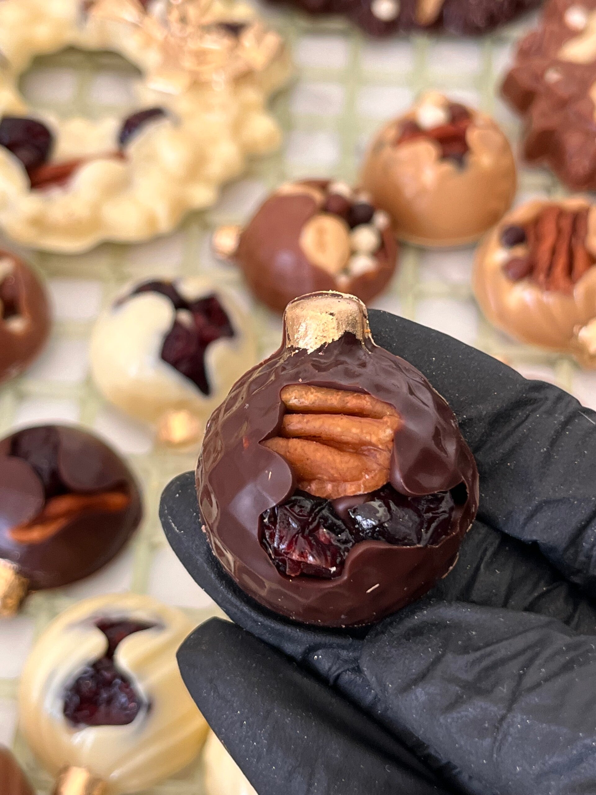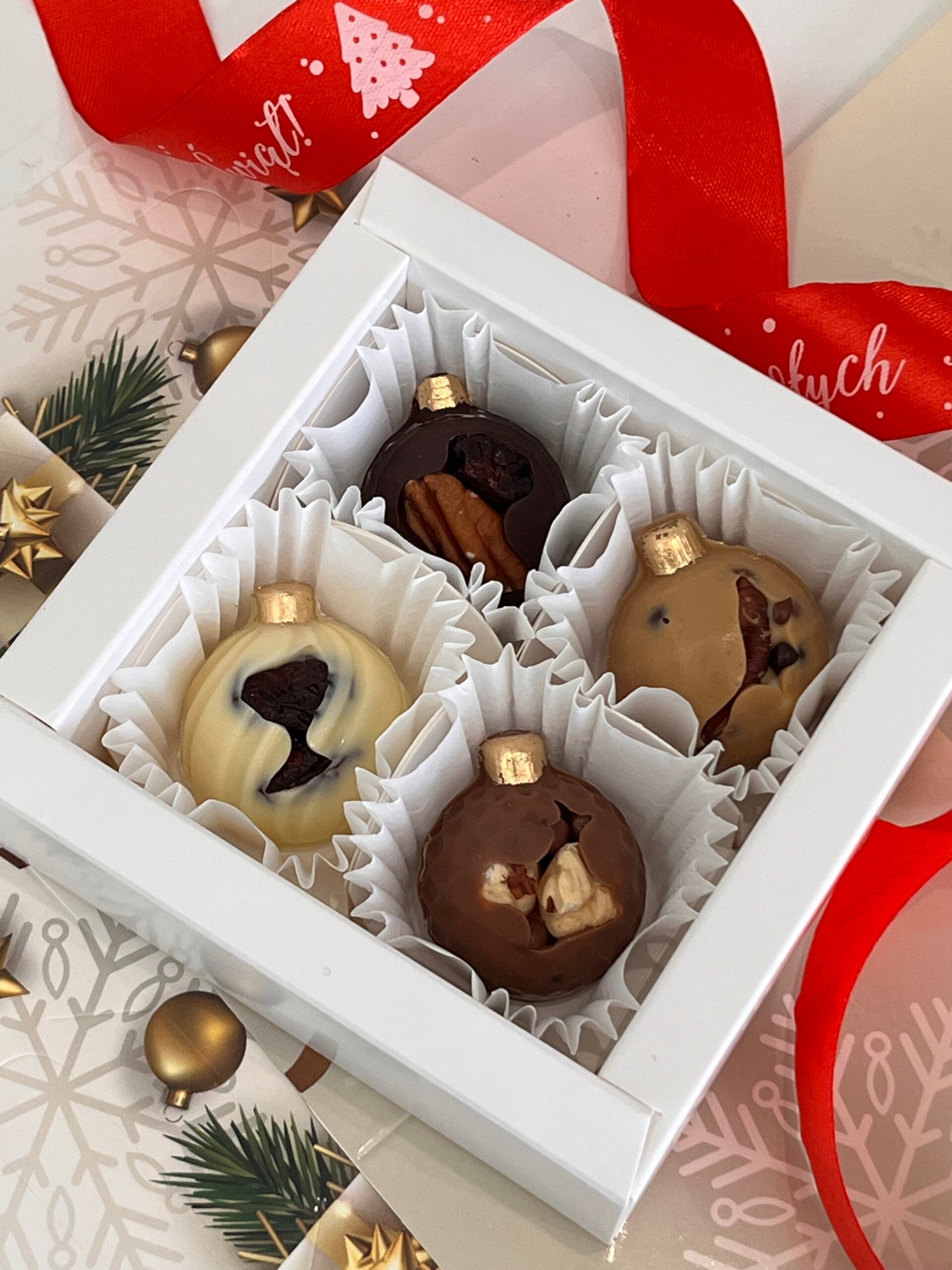Ręcznie robione pralinki z belgijskiej czekolady w kształcie bombek świątecznych. Idealne jako słodki prezent pod choinkę lub upominek dla bliskich.
