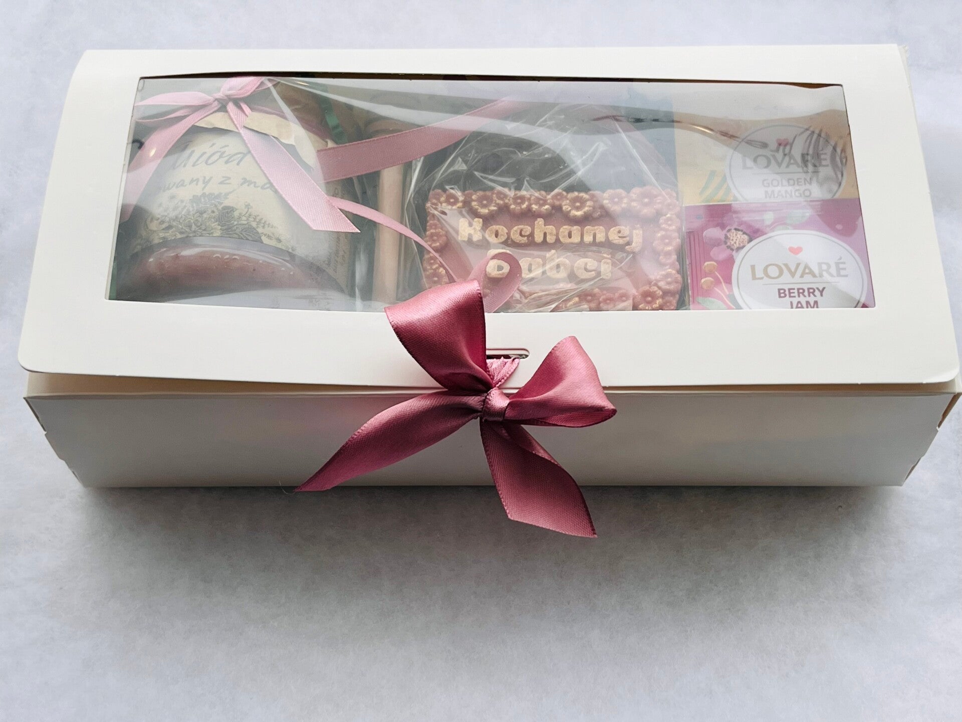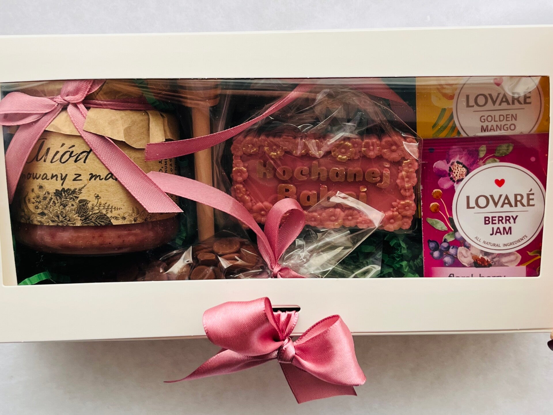 - Tabliczka czekoladowa z napisem "Kochanej babci" (czekolada belgijska, truskawkowa)