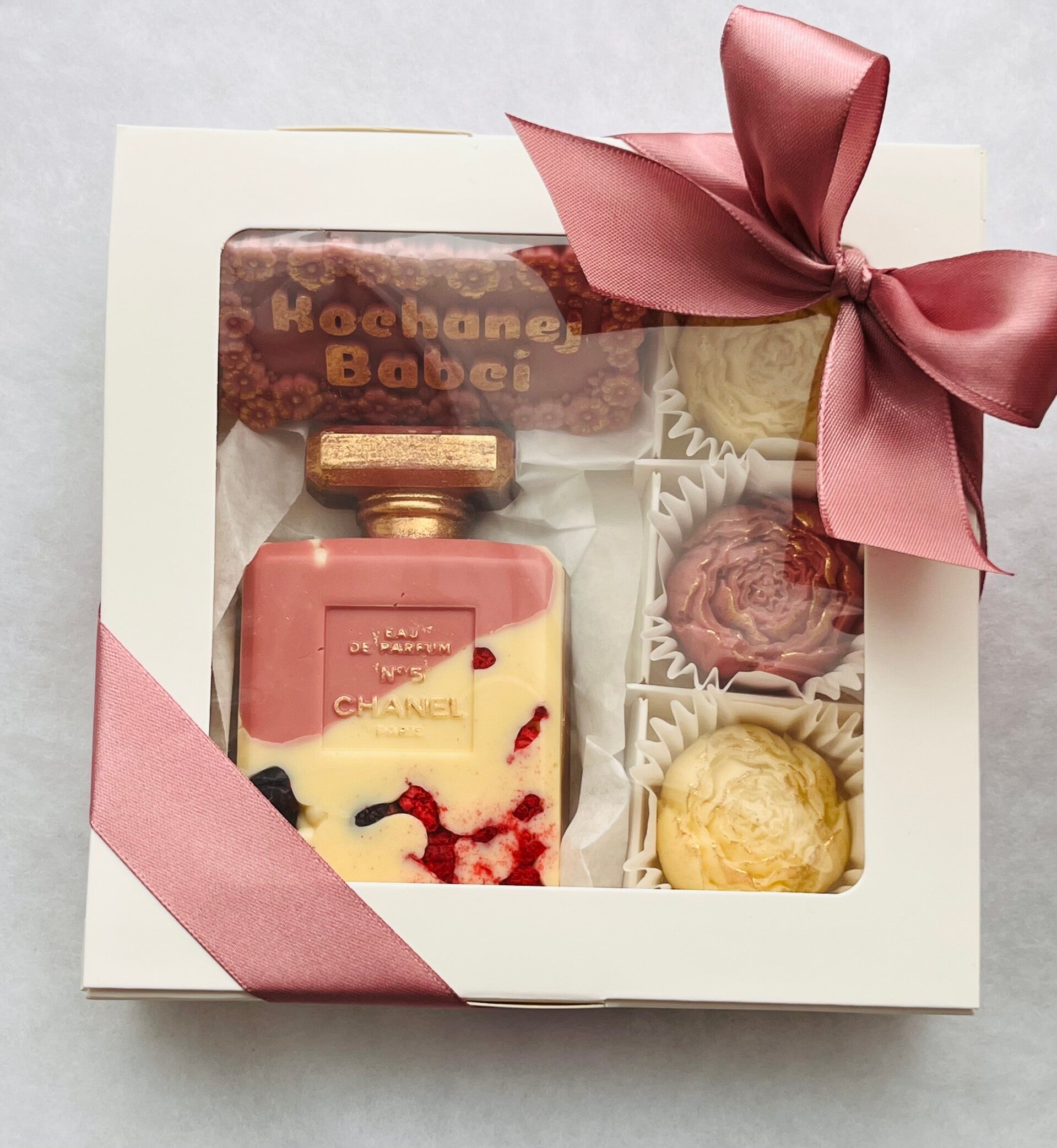 Ten elegancki zestaw ręcznie robionych czekoladek to doskonały sposób, aby powiedzieć: „Kochanej Babci” w najsłodszy możliwy sposób