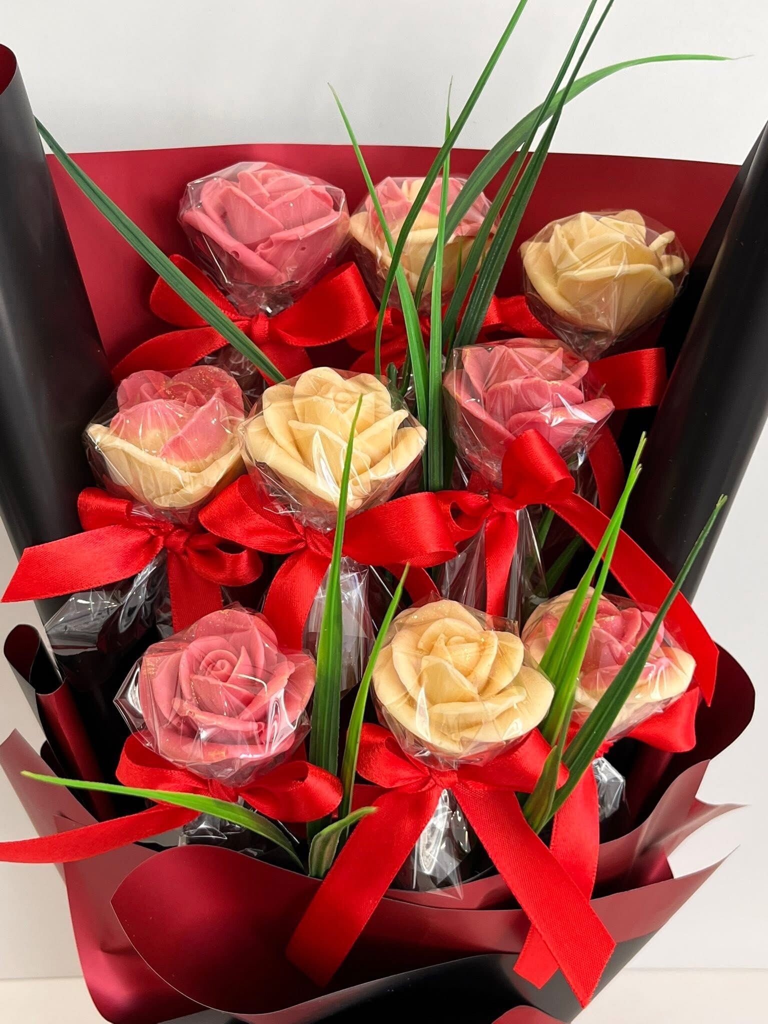- bukiet róż z czekolady białej oraz truskawkowej
