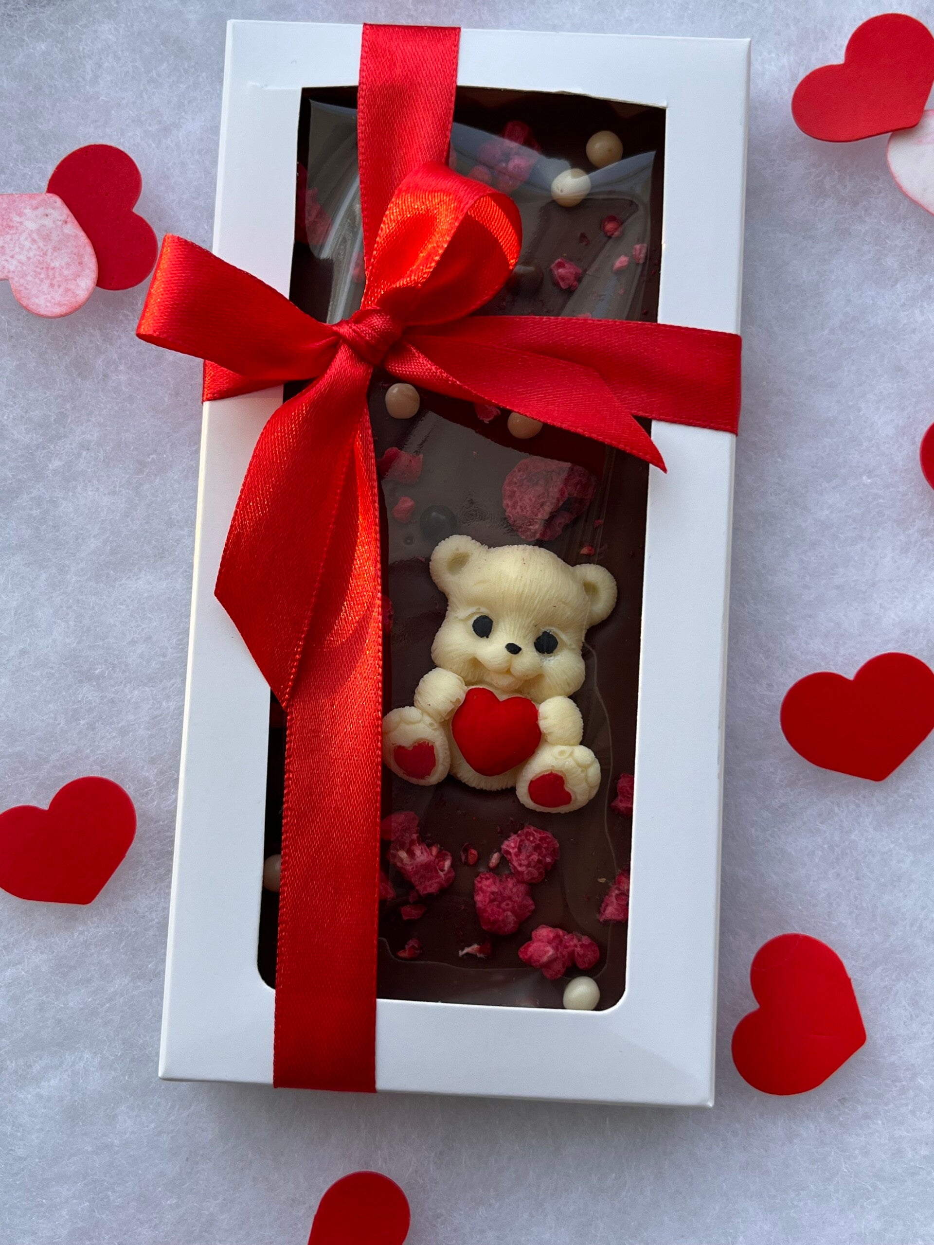 Elegancka tabliczka mlecznej czekolady belgijskiej z dodatkiem różnych orzechów posiekanych , zapakowana w stylowe pudełko z okienkiem i ozdobiona piękną czerwoną kokardą. W środku znajduje się uroczy miś 2D trzymający serduszko, wykonany z białej (lub truskawkowej) czekolady, oraz dekoracyjne posypki(kulki chrupiące), maliny liofilizowane które dodają całości wyjątkowego uroku.