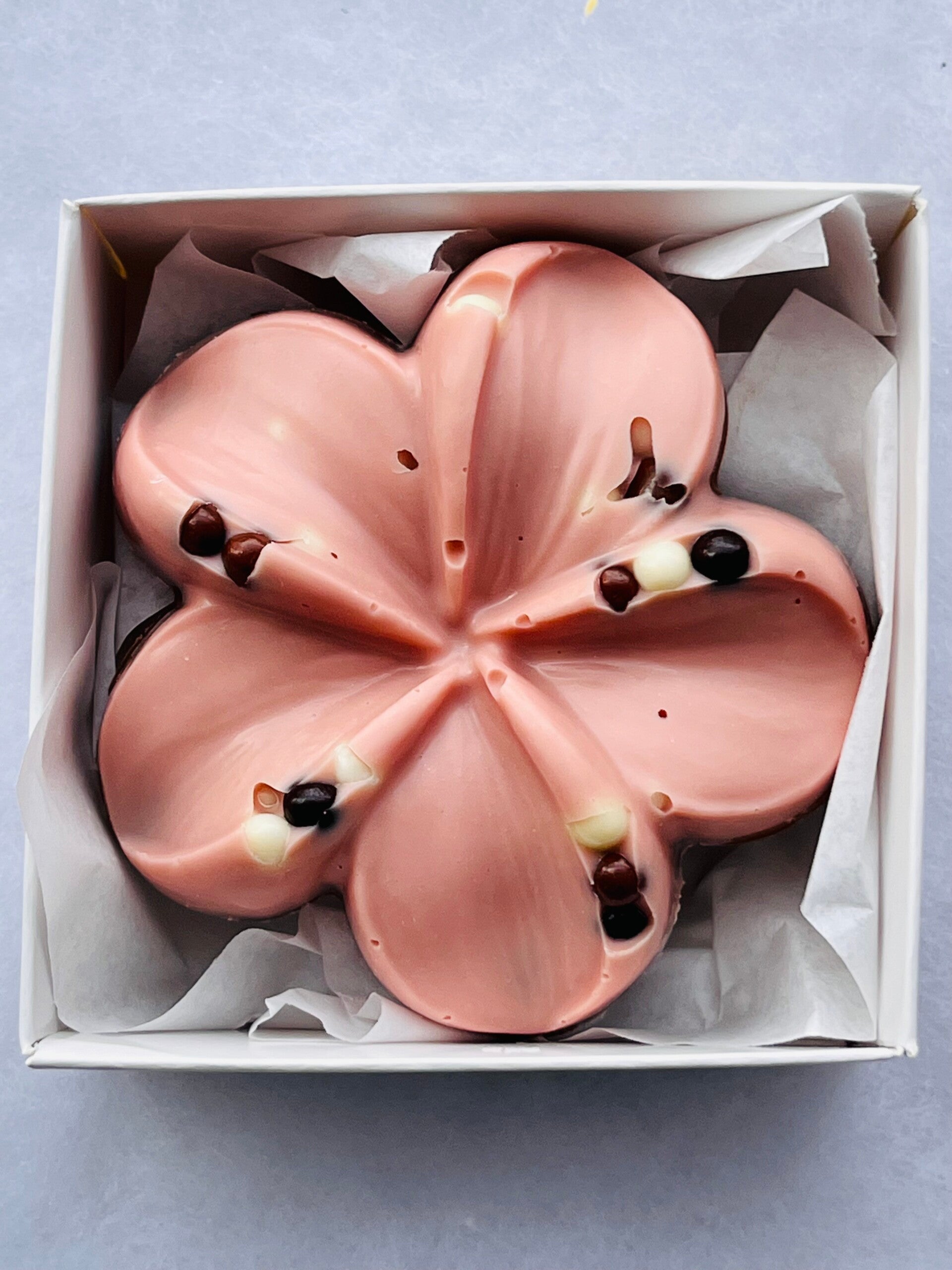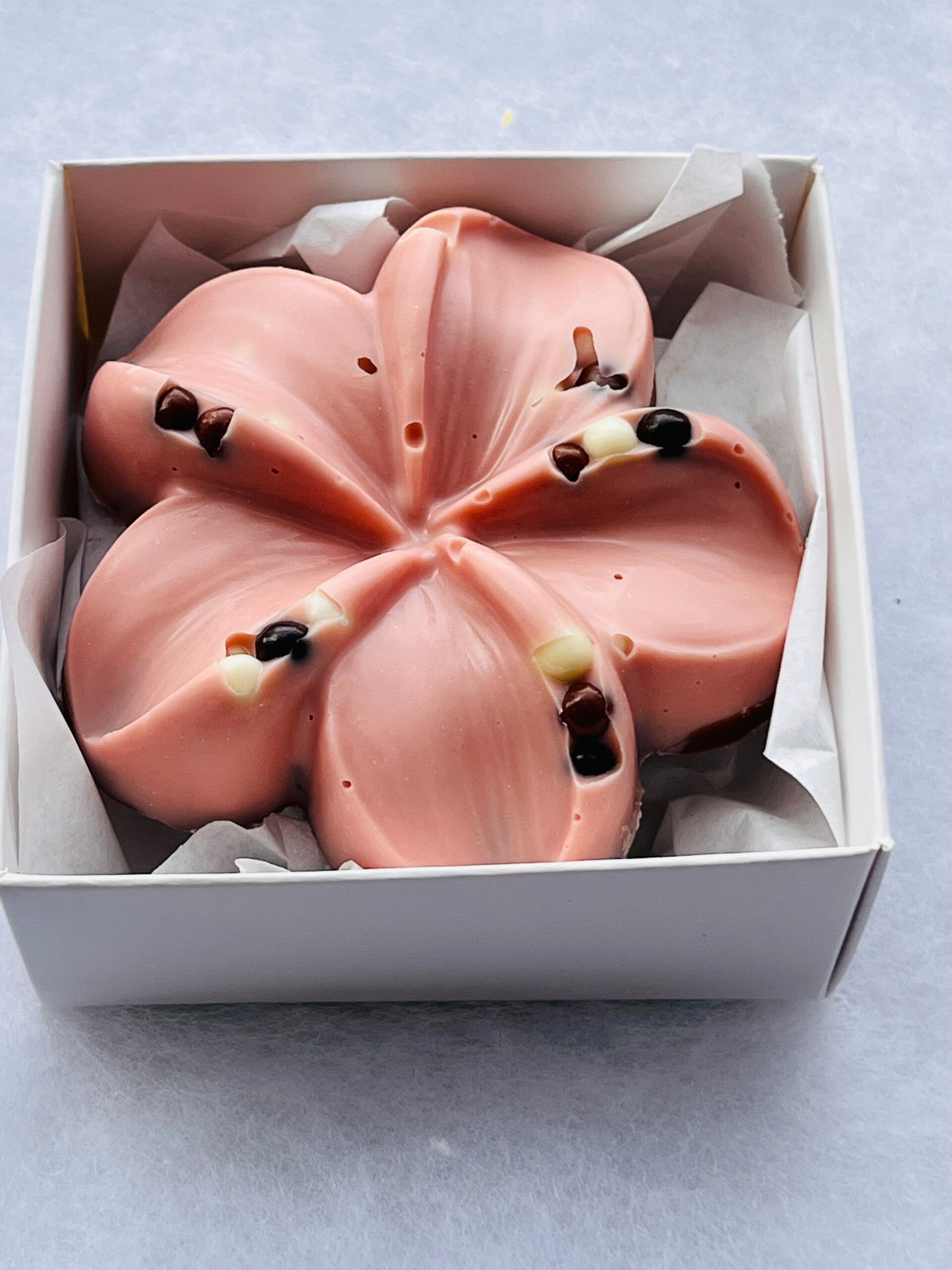 Wyjątkowa czekolada w kształcie egzotycznego kwiatu plumerii (frangipani). Zachwyca eleganckim, różowym kolorem oraz precyzyjnie wykonanymi detalami. To nie tylko słodka przyjemność, ale także piękna i oryginalna forma prezentu.