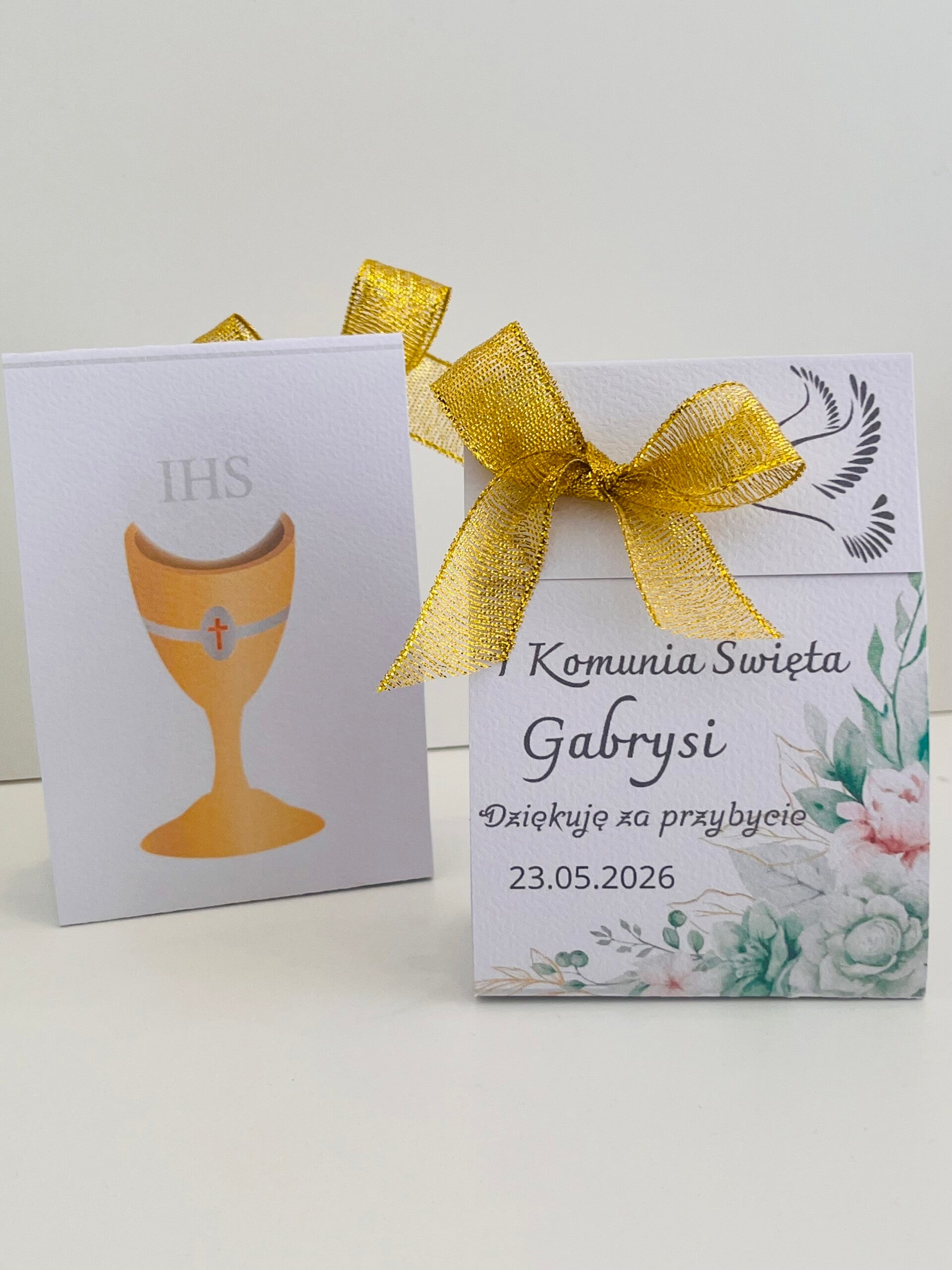 Eleganckie pudełeczko komunijne z personalizacją to wyjątkowy sposób, aby podziękować gościom za obecność w tym szczególnym dniu. Subtelna grafika z kielichem IHS oraz delikatnym motywem kwiatowym w połączeniu ze złotą kokardą nadaje całości uroczysty i stylowy charakter.