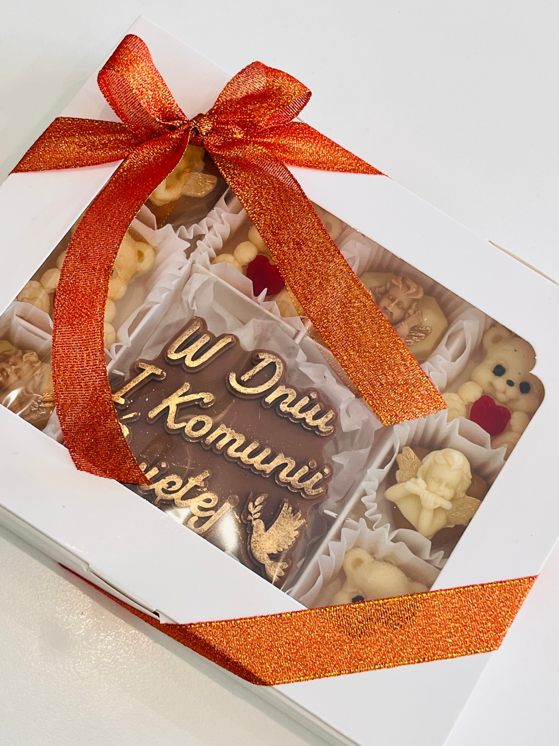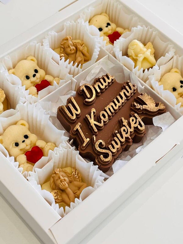Elegancki zestaw ręcznie robionych czekoladek, idealny jako prezent z okazji I Komunii Świętej.