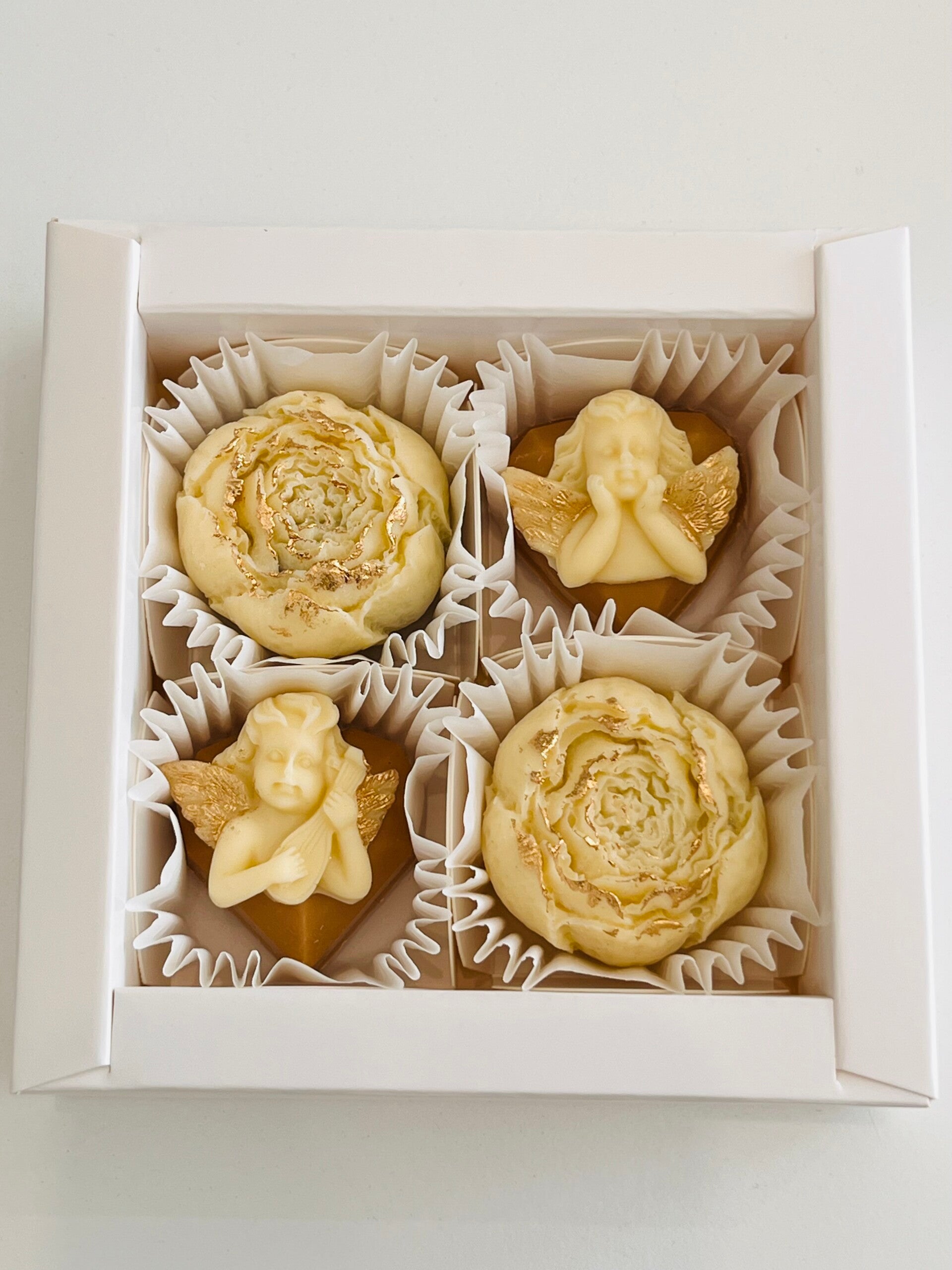 - figurki z białej, karmelowej czekolady: serduszko + aniołek